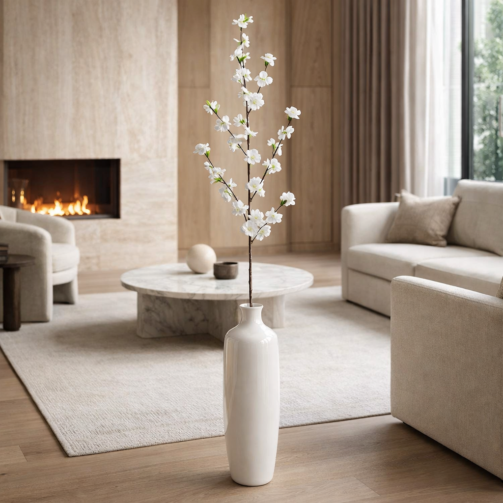 Ramo lungo di fiore di pesco artificiale bianco alto 125 cm, ideale per decorazioni eleganti e composizioni floreali raffinate. Il colore bianco puro dona luminosità e armonia agli ambienti.