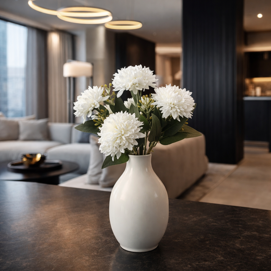 I fiori presentano petali fitti e voluminosi che riproducono fedelmente l’effetto naturale del crisantemo, donando movimento e intensità alla decorazione.