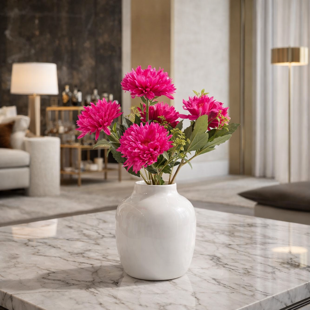 Vivace mazzetto di fiori artificiali 5 teste stile crisantemo pompon, ideale per composizioni floreali moderne e allestimenti colorati.