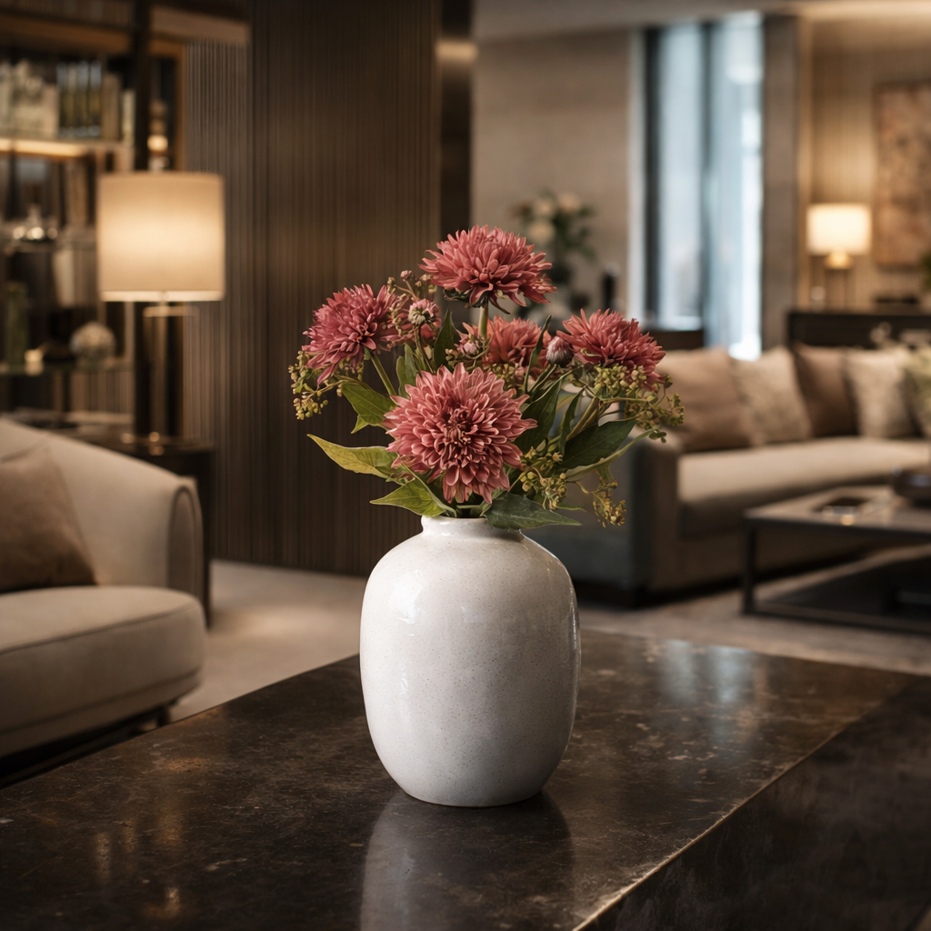 I fiori presentano petali fitti e voluminosi che riproducono fedelmente l’effetto naturale del crisantemo, donando movimento e intensità alla decorazione.