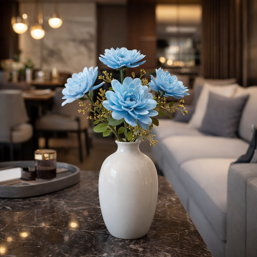 Raffinato mazzetto di fiori artificiali 5 teste stile dalia, ideale per composizioni floreali eleganti e decorazioni stagionali. I petali pieni e realistici donano volume e un effetto naturale agli ambienti.