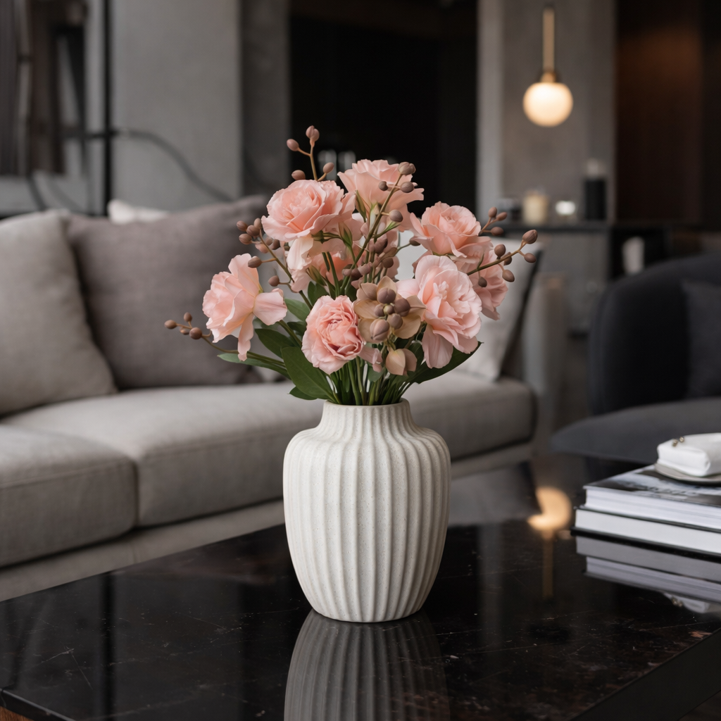 Elegante mazzetto di fiori artificiali 10 teste con dettagli decorativi e bacche ornamentali, ideale per composizioni floreali scenografiche e allestimenti raffinati.