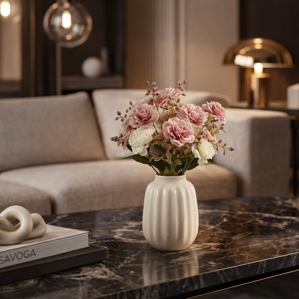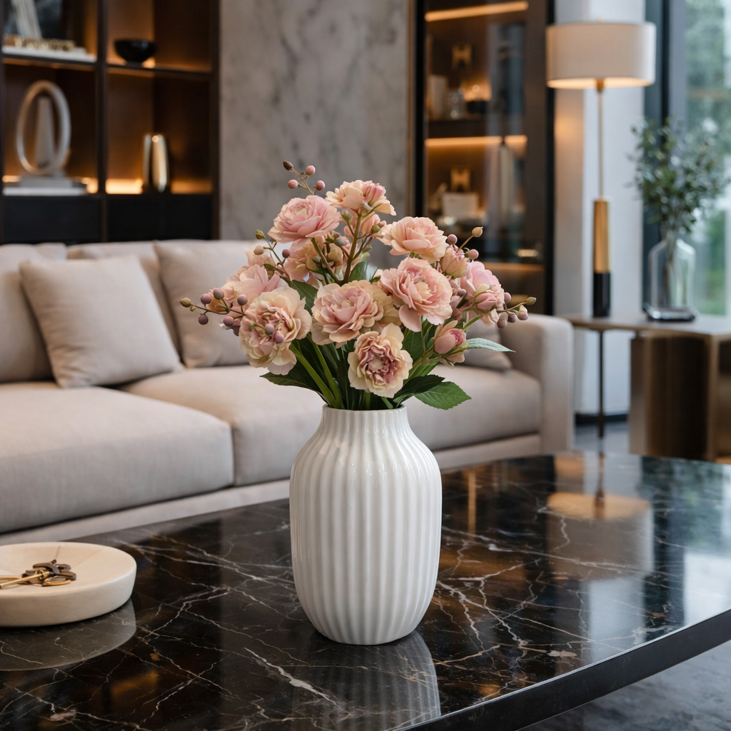 Elegante mazzetto di fiori artificiali 10 teste con dettagli decorativi e bacche ornamentali, ideale per composizioni floreali scenografiche e allestimenti raffinati.