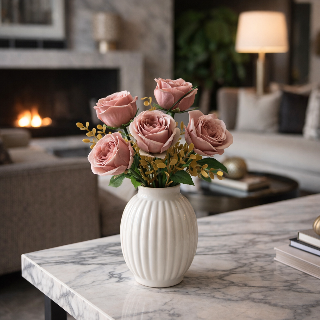 Raffinato mazzetto di rose artificiali 5 teste con fogliame decorativo, ideale per composizioni floreali eleganti e allestimenti stagionali. Le rose presentano petali realistici con delicate sfumature naturali.
