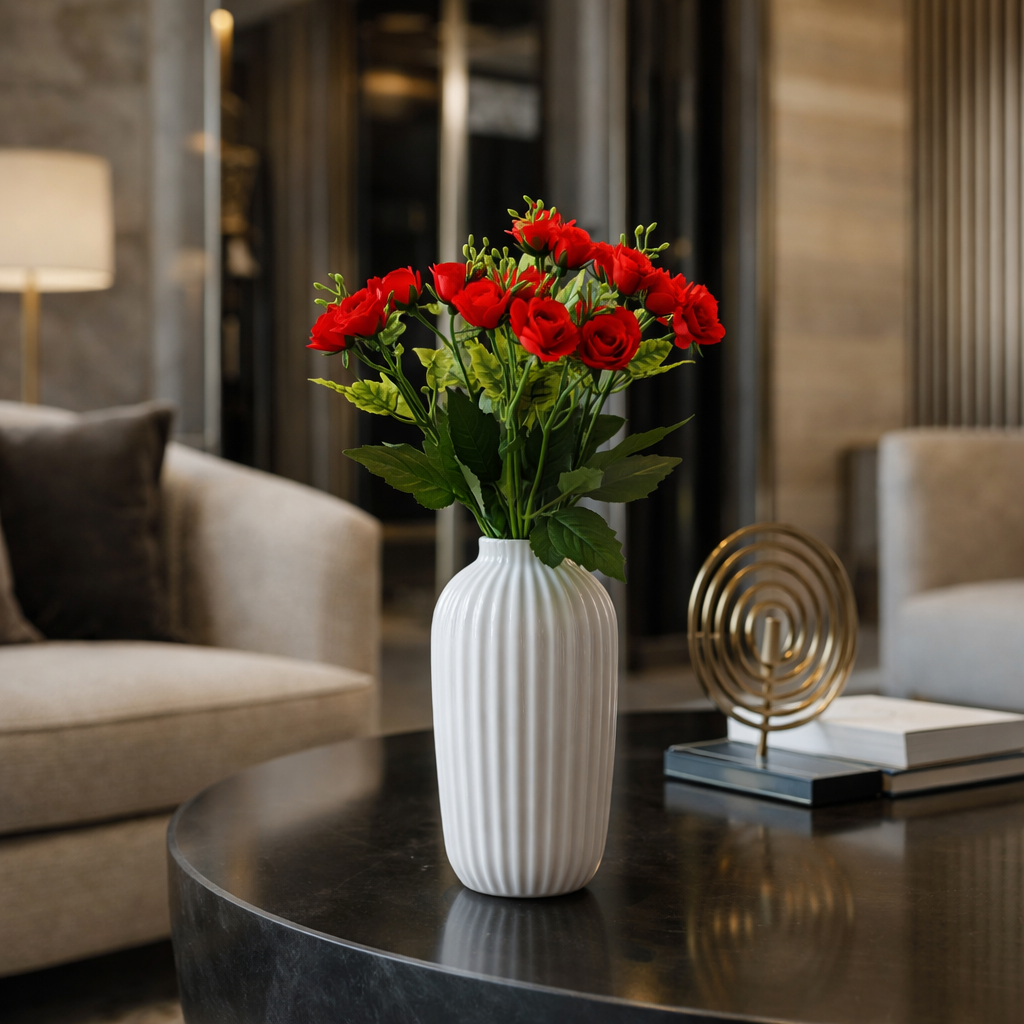 Elegante mazzetto di rose artificiali alto 30 cm, perfetto per decorazioni raffinate e composizioni floreali compatte. Ideale per vasi medi, centrotavola e allestimenti per eventi.
