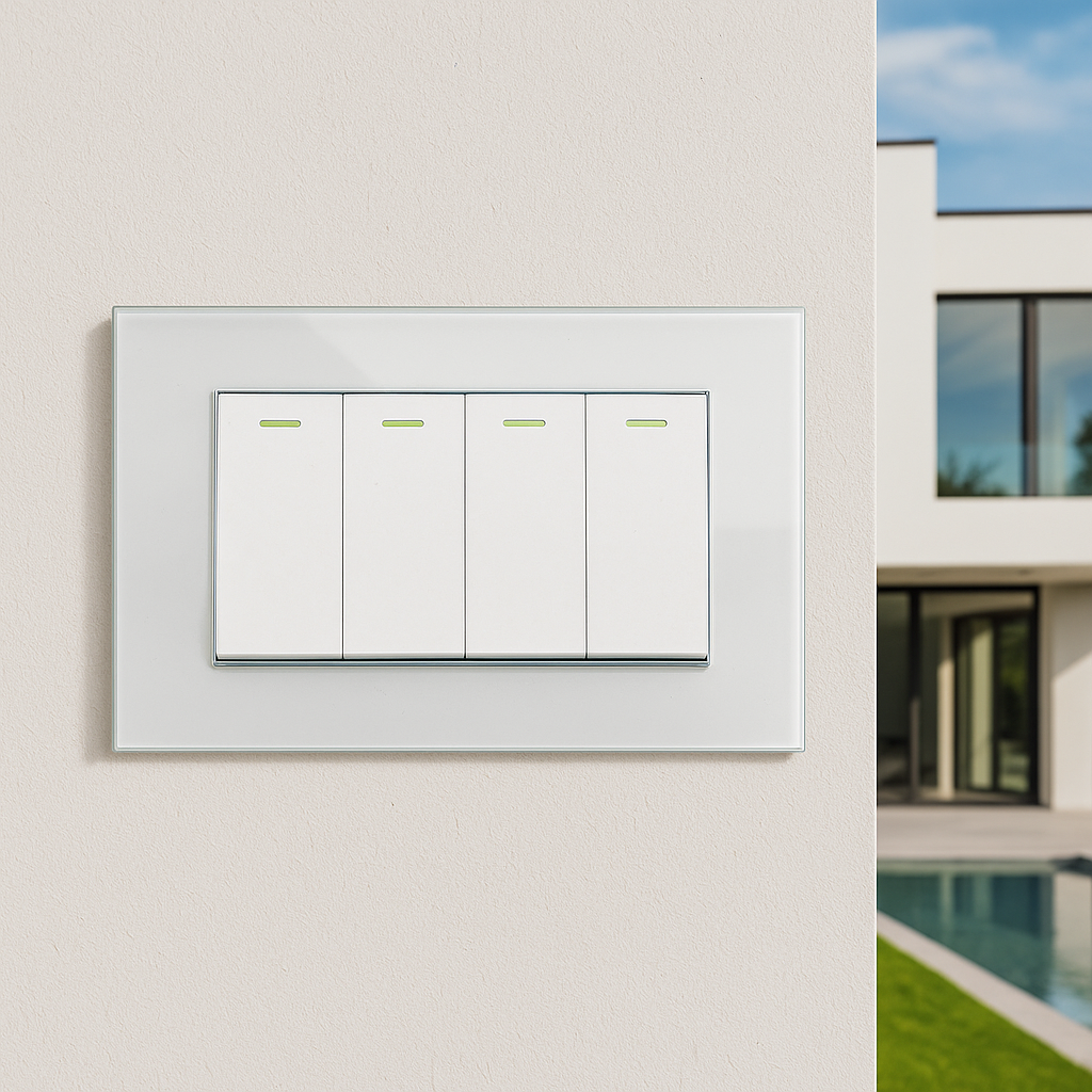 Placca a 4 posti in vetro temperato di alta qualità con finitura bianco lucido, progettata per offrire eleganza, resistenza e luminosità in ogni ambiente. La superficie riflettente e perfettamente liscia dona un aspetto moderno e raffinato, adattandosi con stile sia agli spazi residenziali che a quelli professionali. Compatibile con tutti i frutti modulari della “Serie Ginevra”.