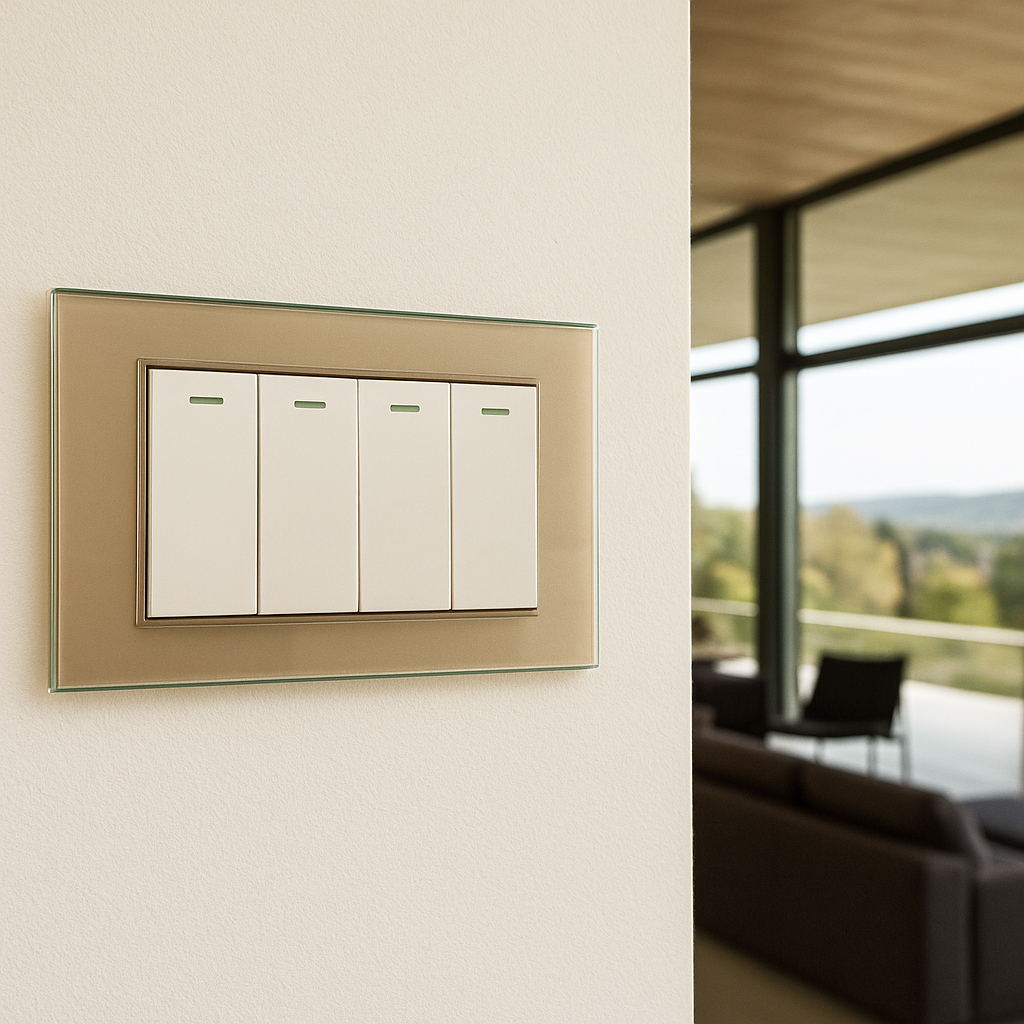 Placca a 4 posti in vetro temperato di alta qualità con finitura oro lucido, ideale per chi desidera un dettaglio di classe e un tocco di lusso negli ambienti domestici o professionali. La superficie liscia e riflettente crea un effetto elegante e luminoso, perfettamente abbinabile sia ad arredamenti moderni che classici. Compatibile con tutti i frutti modulari della “Serie Ginevra”.