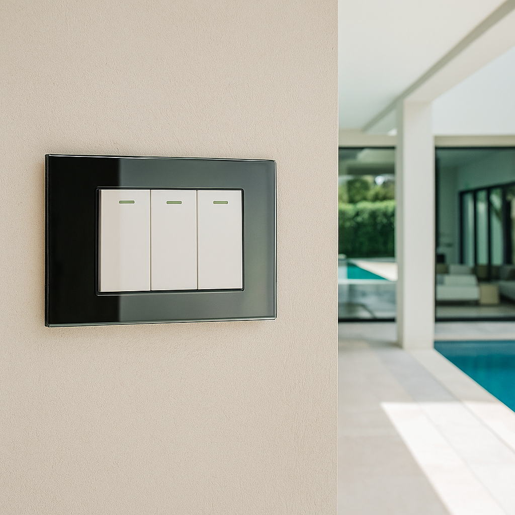 Placca a 3 posti in vetro temperato di alta qualità con finitura nero lucido, pensata per chi desidera un look elegante, moderno e di forte impatto visivo. La superficie specchiata e perfettamente liscia aggiunge profondità e carattere agli ambienti, integrandosi perfettamente sia con arredamenti minimalisti che con interni di lusso. Compatibile con tutti i frutti modulari della “Serie Ginevra”.