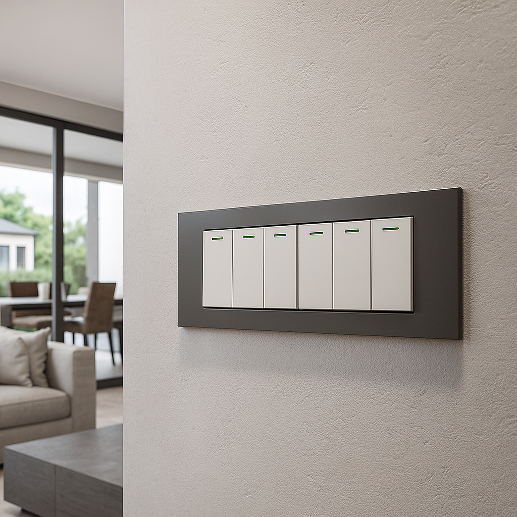 Placca a 6 posti in raffinata finitura acciaio satinato, realizzata in policarbonato autoestinguente V0 con rivestimento effetto metallo, progettata per offrire robustezza, stile e durata nel tempo. Il design moderno e il profilo sottile la rendono perfetta per grandi composizioni di comandi e prese, garantendo un tocco industrial chic e una resistenza superiore all’usura. Compatibile con tutti i frutti modulari della “Serie Ginevra”.
