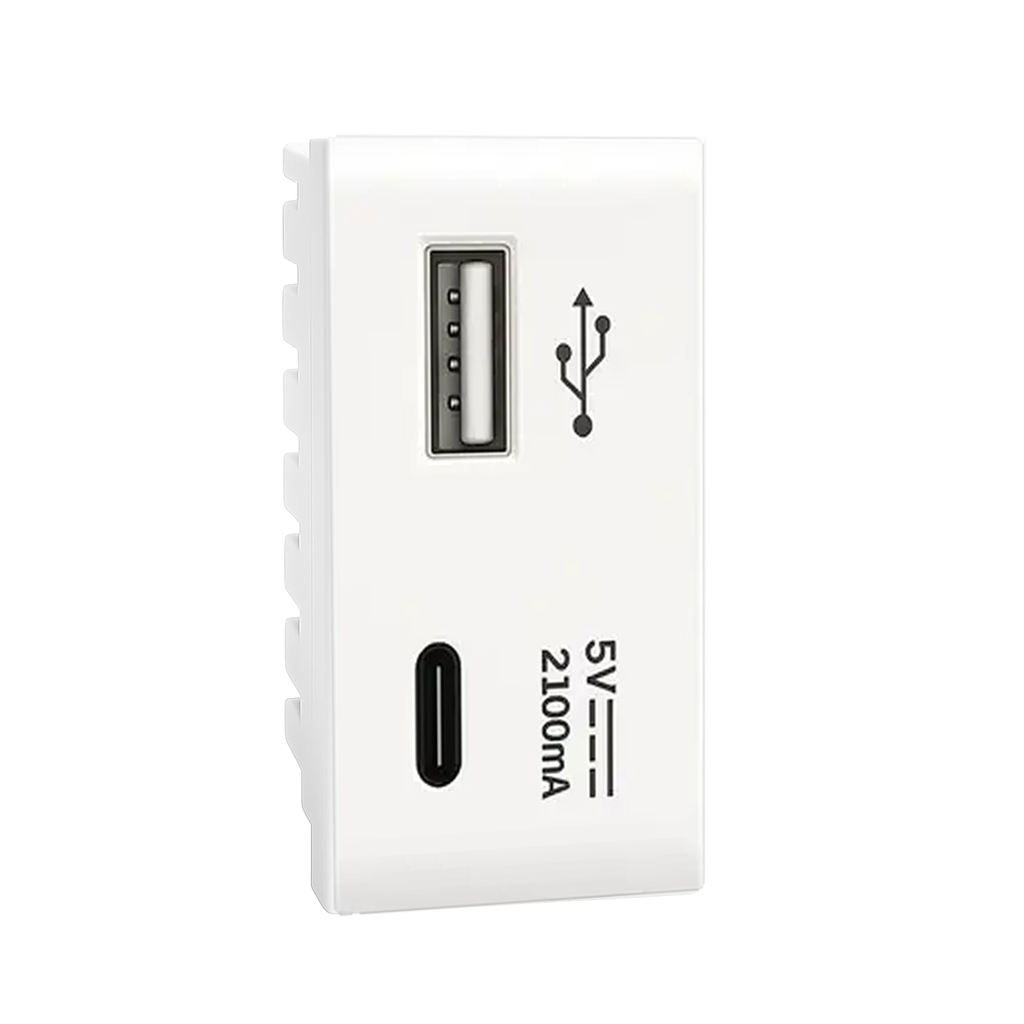 Modulo combinato 1M che integra un interruttore unipolare con doppia porta di ricarica USB-A e USB Type-C, progettato per fornire fino a 2100mA a 5V per ricaricare in sicurezza smartphone, tablet e dispositivi elettronici. Design elegante in finitura bianco opaco, perfettamente coordinato alla “Serie Ginevra”, per unire funzionalità e stile in un solo modulo compatto.