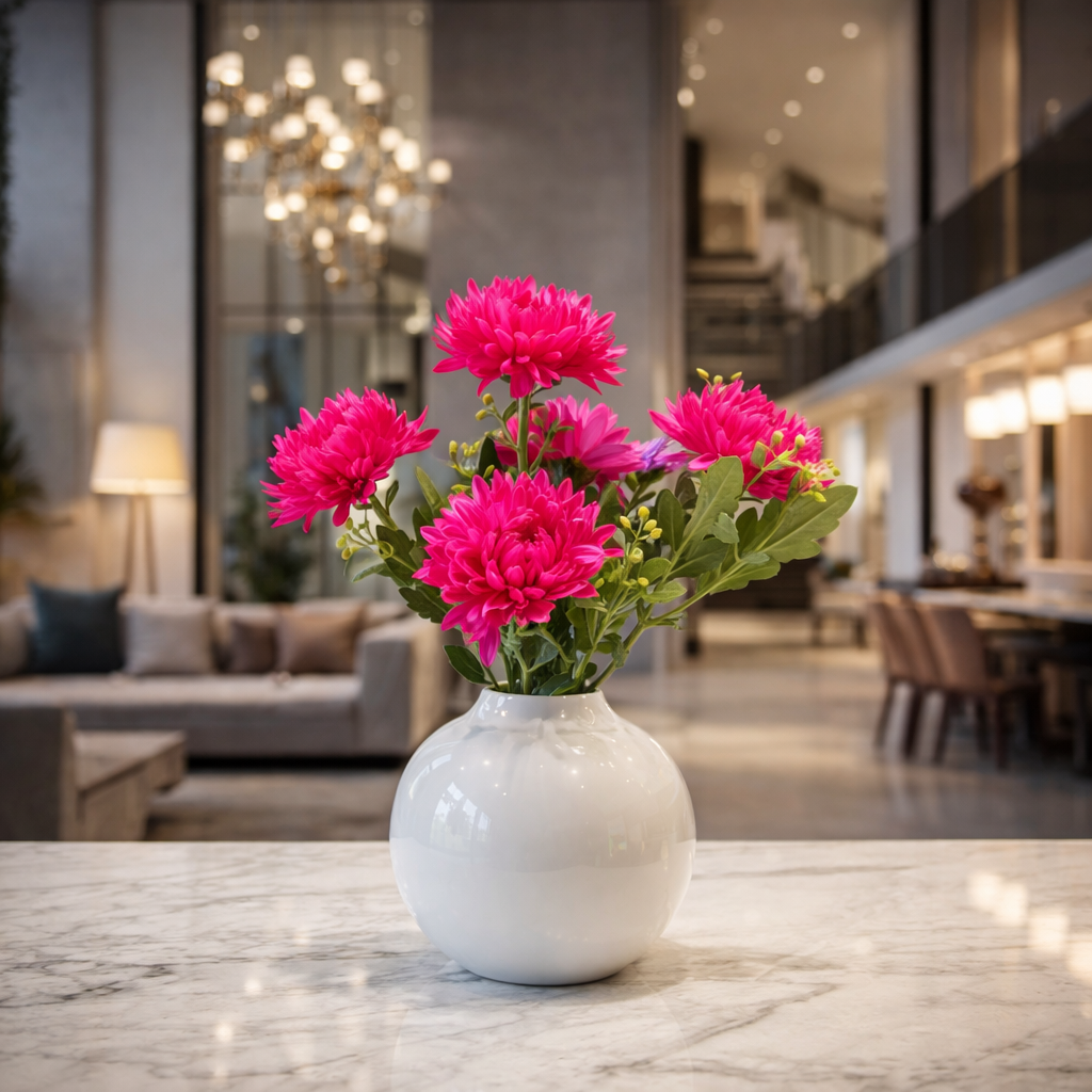 I fiori presentano petali fitti e voluminosi che riproducono fedelmente l’effetto naturale del crisantemo, donando movimento e intensità alla decorazione.