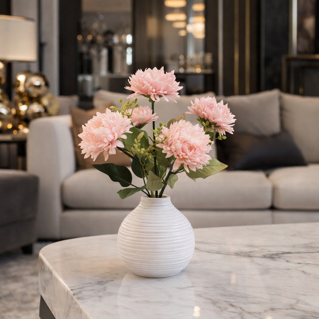 I fiori presentano petali fitti e voluminosi che riproducono fedelmente l’effetto naturale del crisantemo, donando movimento e intensità alla decorazione.