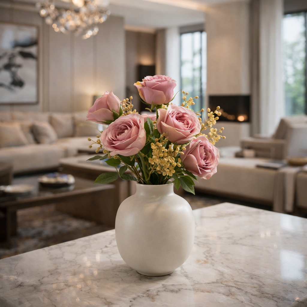 Raffinato mazzetto di rose artificiali 5 teste con fogliame decorativo, ideale per composizioni floreali eleganti e allestimenti stagionali. Le rose presentano petali realistici con delicate sfumature naturali.