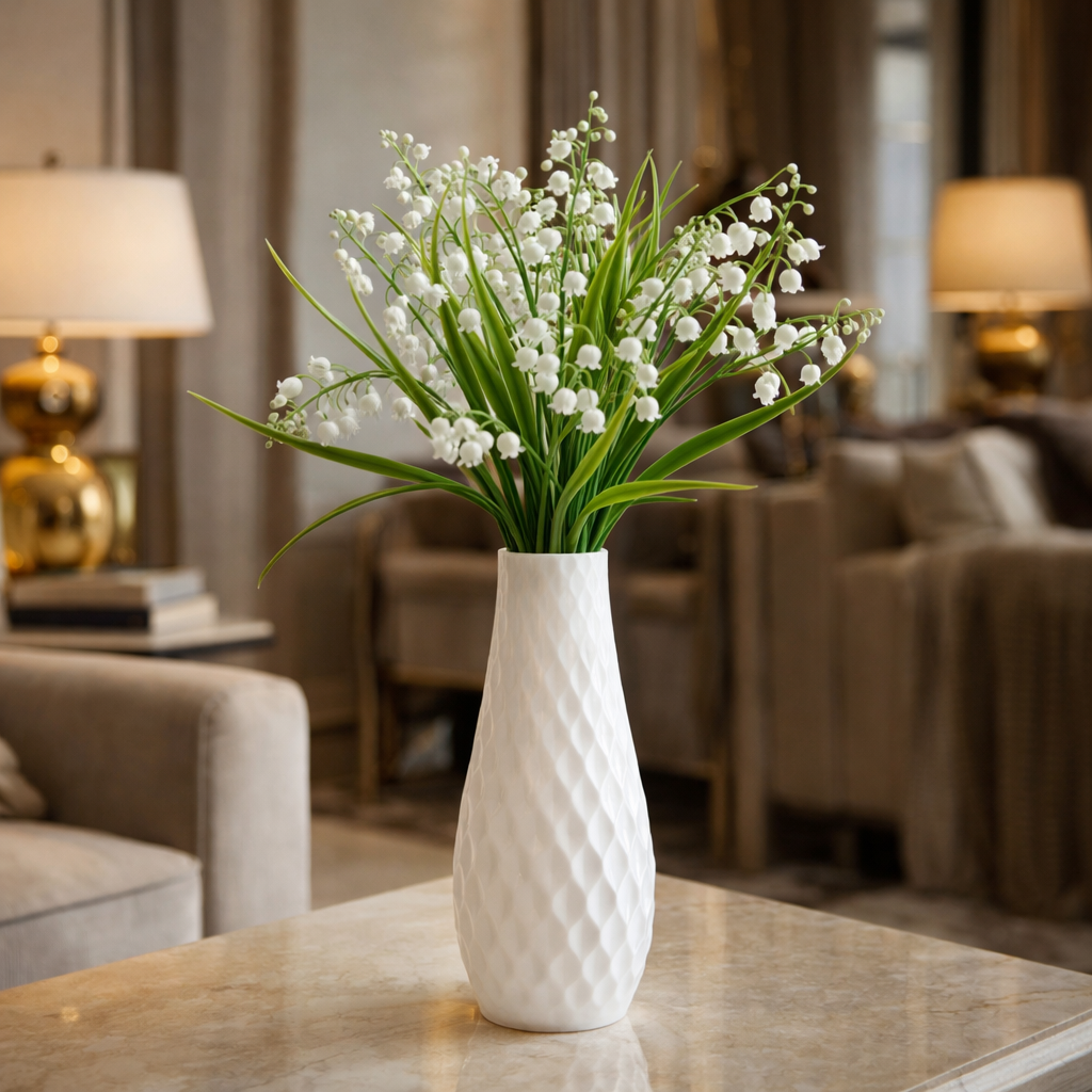 Il mazzo di mughetto artificiale con campanellini bianchi è una decorazione elegante e raffinata ideale per arricchire ambienti interni con uno stile naturale e delicato. I piccoli fiori a forma di campanella e le foglie verdi sottili riproducono fedelmente l’aspetto del mughetto naturale.